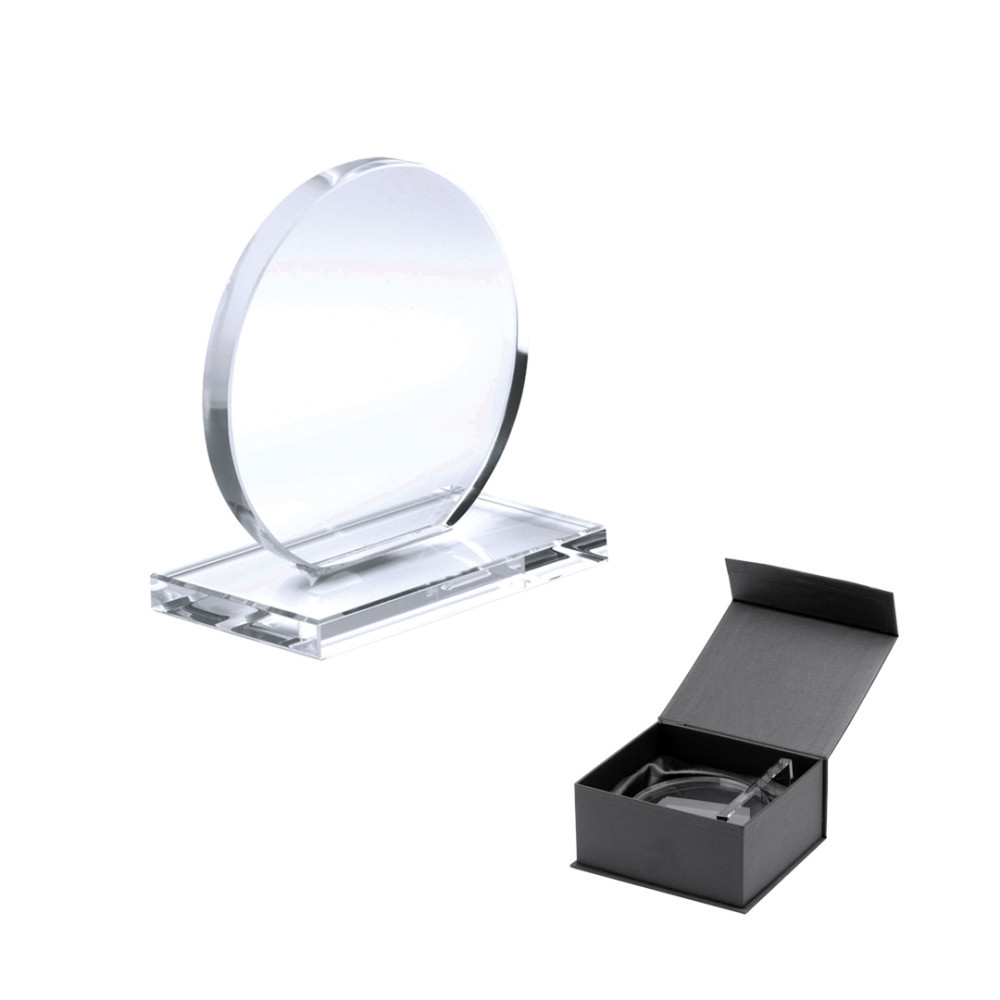 Κρυσταλλινη κορνιζα/βραβείο με κουτί ΔΑ 10cm διάμετρος ΧΕ 4*5 Χάραξη